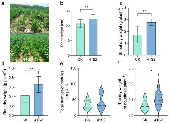 Effects of B. velezensis 41S2 on soybean growth phenotype under salt–alkaline soil. (a) Growth phenotypes. (b) Plant height. (c) Shoot dry weight. (d) Root dry weight. (e) Total number of nodules per plant. (f) Root nodule weight per plant. Soybean seedlings are grown in salt–alkaline soil without (CK) or with strain 41S2 (41S2). Values are means ± SD, n ≥ 12 independent biological replicates. Asterisks indicate significant differences between CK and 41S2 treatments: * p < 0.05 and ** p < 0.01 by two-tailed Student’s t-test.