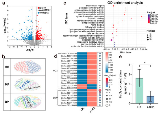 B. velezensis 41S2 maintains ROS homeostasis under salt–alkaline soil. (a) Volcano plot showing the DEGs under salt–alkaline soil (41S2 vs. CK). Red: up-regulated genes; blue: down-regulated genes. (b) GO annotation analysis; CC: cellular component, MF: Molecular function, BP: biological process. (c) GO enrichment analysis. (d) Expression patterns of POX and CYP genes. (e) H2O2 concentration. Soybean seedlings are grown in salt–alkaline soil without (CK) or with 41S2 (41S2). Values are means ± SD, with three independent biological replicates. Asterisks indicate significant differences between CK and 41S2 treatments: * p < 0.05 by two-tailed Student’s t-test.