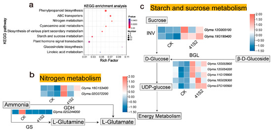 KEGG enrichment analysis revealed that inoculation with B. velezensis 41S2 significantly affected several key metabolic pathways in soybean roots under salt–alkaline soil (Figure 3). DEGs were significantly enriched in phenylpropanoid biosynthesis, N metabolism, and starch/sucrose metabolism in 41S2-inoculated plants (Figure 3a). In the N metabolism pathway, the expression of the genes Glyma.16G153400 and Glyma.02G07220, which encode the enzyme glutamate dehydrogenase (GDH), was significantly upregulated in response to induction by strain 41S2 (Figure 3b). GDH plays a central role in ammonium assimilation and N flux regulation, suggesting that 41S2 enhances N assimilation by facilitating the direct conversion of ammonium to L-glutamate (Figure 3b). For C metabolism, inoculation with strain 41S2 significantly activated the starch and sucrose metabolism pathway, particularly promoting the synthesis of D-glucose. Under salt stress, genes encoding β-glucosidase (BGL) and invertase (INV) were markedly upregulated, leading to increased D-glucose accumulation (Figure 3c). These carbohydrates serve as crucial energy sources, feeding into glycolysis and the tricarboxylic acid (TCA) cycle to generate ATP and reducing equivalents (NADH/NADPH), which are essential for meeting the elevated energy demands under saline stress. These results suggest that B. velezensis 41S2 enhances plant salt tolerance by coordinately modulating C and N metabolic pathways, thereby supporting metabolic homeostasis under salt–alkaline conditions.