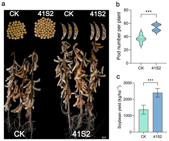 At the maturity stage, the effect of B. velezensis 41S2 inoculation on soybean seed yield was evaluated (Figure 4). Under salt–alkaline soil, 41S2-inoculated plants exhibited a significant yield advantage compared to the control (Figure 4a). Specifically, the number of pods per plant and seed yield per plant increased by 45% and 75%, respectively, relative to the control (Figure 4b,c). These findings demonstrate the substantial yield-enhancing potential of strain 41S2 in soybean cultivation under salt–alkaline soil. This provides a practical and effective microbial strategy for improving soybean productivity in saline-affected soils, with significant implications for broader field application.