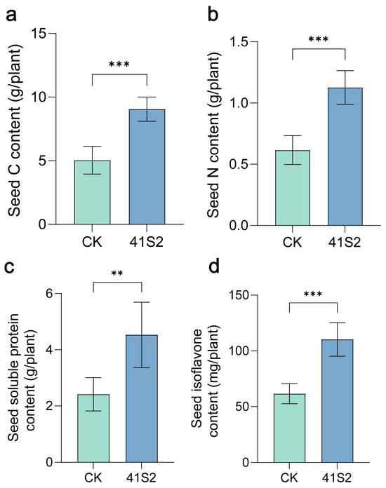 B. velezensis 41S2 improves seed quality under salt–alkaline soil. (a,b) C and N accumulation per plant. (c) Soluble protein content per plant. (d) Isoflavone content per plant. Values are means ± SD, with six independent biological replicates. Asterisks indicate significant differences between CK and 41S2 treatments: ** p < 0.01 and *** p < 0.001 by two-tailed Student’s t-test.