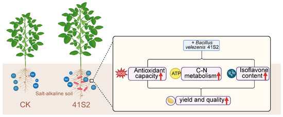 Schematic illustration depicting the role of B. velezensis 41S2 in promoting soybean production in salt–alkaline soil. The schematic diagram was created in BioRender. Wang Y.Q. (2025) https://app.biorender.com/illustrations/68b12ff5000b247d39abbe7f?slideId=c4abcc64-7681-4fbb-afda-db6586140d0e, accessed on 24 August 2025.