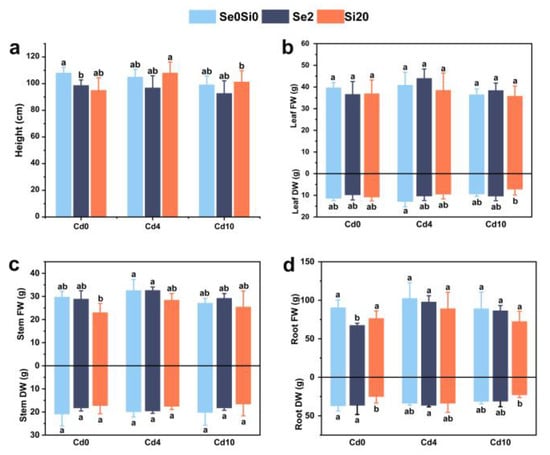 Effects of Se and Si on the growth parameters of A. argyi under Cd stress. (a) Plant height; (b) fresh and dry leaf weight; (c) fresh and dry stem weight; (d) fresh and dry root weight. Lowercase letters in the bar graph indicate significant differences among treatments at p < 0.05.