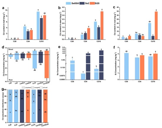 Effects of Se and Si on Cd content in different parts of A. argyi under Cd stress. (a) Cd content in leaves; (b) Cd content in stems; (c) Cd content in roots; (d) Cd content in aboveground and underground parts; (e) Se content in leaves; (f) Si content in leaves; (g) Cd subcellular distribution assays. Lowercase letters in the bar graph indicate significant differences among treatments at p < 0.05.