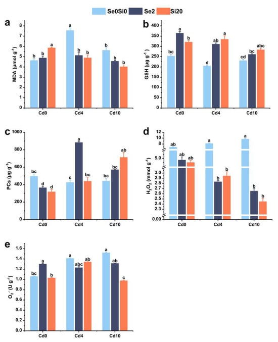 Effects of Se/Si on oxidative stress indicators in A. argyi plants under Cd stress. (a) MDA content; (b) GSH content; (c) PC content; (d) H2O2 content; (e) O2•− content. Lowercase letters in the bar graph indicate significant differences among treatments at p < 0.05.