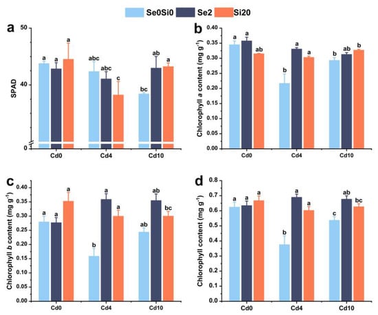 Effects of Se/Si on photosynthetic parameters in A. argyi under Cd stress. (a) SPAD value; (b) chlorophyll a content; (c) chlorophyll b content; (d) total chlorophyll content. Lowercase letters in the bar graph indicate significant differences among treatments at p < 0.05.