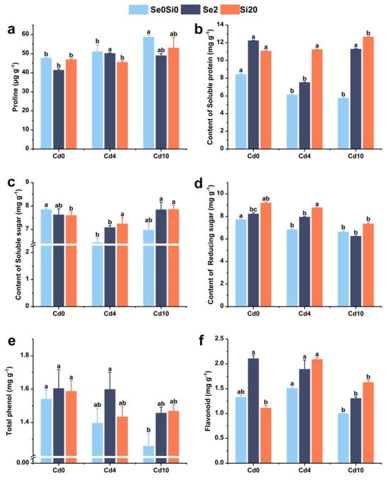 To examine the effects of exogenous Se and Si on osmotic regulation substances in A. argyi under Cd stress, the contents of proline (Pro), soluble protein, soluble sugar, and reducing sugar were measured under different treatment conditions (Figure 5). Under Cd10 stress, Pro content in A. argyi leaves increased compared with the control group (Cd0), indicating Cd-induced damage (Figure 5a). Following the application of Se and Si, Pro content decreased. Under low Cd conditions, Se and Si application resulted in reductions of 1.79% and 10.81% in Pro content, respectively. Under high Cd conditions, reductions of 16.48% and 9.67% in Pro content were observed following Se and Si application, respectively.