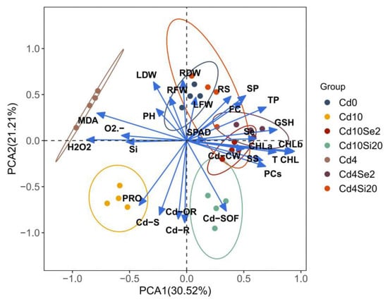 To further examine the relationship between the growth and physiological indices of A. argyi under Cd stress alleviated by Se and Si, 27 indicators were analyzed using principal component analysis (PCA). Two principal components, PC1 (30.52%) and PC2 (21.21%), were extracted. The indicators in the Si treatment group exhibited significant differences compared to those in the Cd0 and Cd treatment groups, with Cd10Si20 showing the most pronounced difference from other treatments. Overall, both Se and Si treatments effectively alleviated the adverse effects of Cd stress on A. argyi (Figure 6).