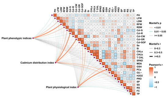 Correlation analysis of phenotypic and physicochemical indices, illustrating pairwise comparisons of physicochemical indices under various treatments. The color gradient represents Pearson’s correlation coefficient (* p < 0.05, ** p < 0.01, *** p < 0.001). Plant phenotypic indices (plant height, leaf biomass, stem biomass, root biomass), Cd distribution indices (Cd content in shoot, Cd content in root, Cd content in subcellular components), and physiological indices (SPAD, chlorophyll content, osmoregulatory substances, peroxidation index) were analyzed for correlations using the Mantel test. Edge widths correspond to Mantel’s r statistic for distance correlation, with edge colors indicating statistical significance based on 999 permutations. PH, plant height; LFW, leaf fresh weight; LDW, leaf dry weight; RFW, root fresh weight; RDW, root dry weight; Cd-S, Cd content in shoot; Cd-R, Cd content in root; Cd-CW, Cd content in cell wall; Cd-OR, Cd content in organelles; Cd-SOF, Cd content in cytoplasm; Se, selenium; Si, silicon; CHLa, chlorophyll a content; CHLb, chlorophyll b content; T CHL, total chlorophyll content; MDA, malondialdehyde; GSH, glutathione; PCs, phytochelatins; O2•−, superoxide anion; H2O2, hydrogen peroxide; PRO, proline; SP, soluble protein; SS, soluble sugar; RS, reducing sugar; FC, flavonoid content; TP, total phenolic content.