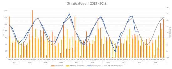 Data on average monthly air temperatures and total monthly precipitation were obtained from the Croatian Meteorological and Hydrological Service from the measuring station Osijek—Klisa, Croatia (Figure 1).