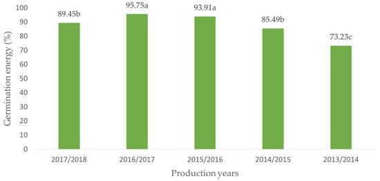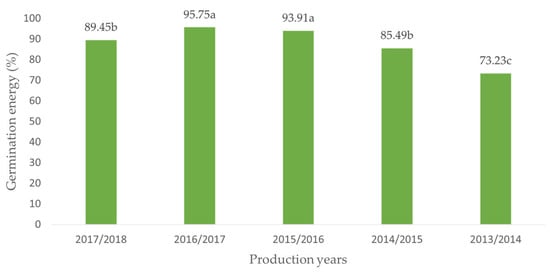 Differences between production years in seed germination energy (different letters correspond to significant differences in means).