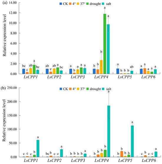 3.9.2. Expression Levels of LsCPP Genes Under Abiotic Stresses