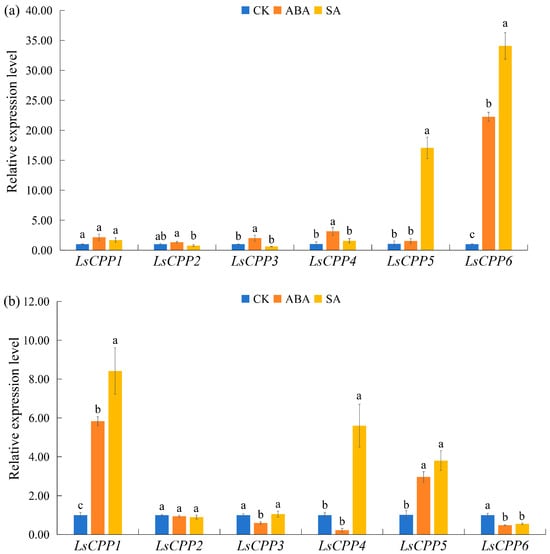 3.9.3. Expression Levels of LsCPP Genes Under Plant Hormone Treatment