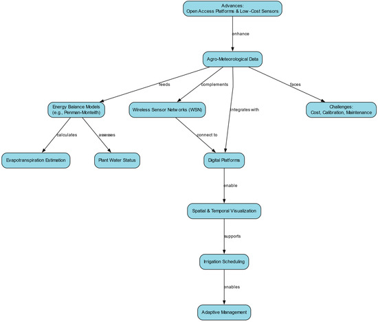 Agro-meteorological data are crucial in energy balance models, which are widely used to estimate crop evapotranspiration (ET) and assess plant water status. These models rely on accurate measurements of environmental variables to quantify the energy fluxes involved in soil and plant water dynamics [117,118]. For instance, the Penman-Monteith equation, a standard model for estimating ET, requires temperature, humidity, wind speed, and solar radiation inputs to calculate the energy balance at the leaf or canopy level [119,120,121]. In vineyards, energy balance models have been utilized to correlate environmental conditions with grape water status, enabling precise irrigation scheduling that minimizes stress while preserving yield and quality [13,122,123]. Similarly, in mango and avocado orchards, these models provide insights into the spatial and temporal variability of water requirements, enabling efficient resource allocation and improved crop performance [48,124,125,126]. Figure 5 illustrates how agro-meteorological data, energy balance models, and WSNs can be integrated into digital platforms to support adaptive irrigation scheduling.