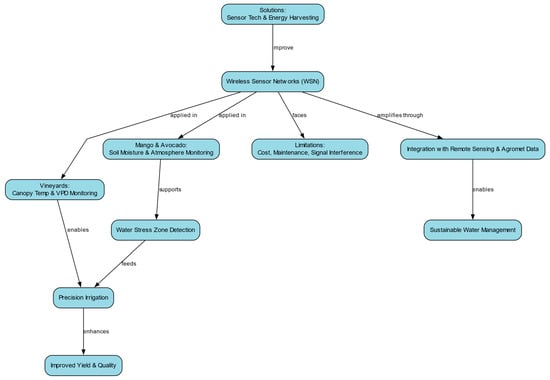 To ensure long-term performance in remote deployments, techniques such as duty cycling (alternating between active and sleep states) and solar-powered units are commonly adopted to enhance energy efficiency [133]. WSNs also enable the continuous monitoring of environmental variables critical for understanding and managing crop water requirements. Among these, air temperature and relative humidity are fundamental in calculating the vapor pressure deficit (VPD), an indicator of the atmospheric demand for water by plants [134]. Wind speed influences transpiration rates by modifying the boundary layer around leaves, while canopy temperature, measured using infrared sensors, directly indicates plant water status [113]. This real-time monitoring capability is especially valuable in dynamic agricultural environments with complex microclimates, such as orchards and vineyards [135]. Figure 7 illustrates the application of WSNs in high-value crops, such as mango, avocado, and vineyards, and how their integration with remote sensing and agrometeorological data supports sustainable water management.