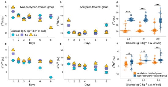 Temporal δ18O (a,b) and δ15NSP (d,e) of N2O in response to varied glucose concentrations in non-acetylene-treated and acetylene-treated vegetable soils. Significant differences in δ18O (c) and δ15NSP (f) between non-acetylene-treated and acetylene-treated groups (Wilcoxon test) are indicated with *** (p < 0.001) or ** (p < 0.01). Letters indicate statistical significance among varied glucose concentrations using a two-sided Wilcoxon test (adjusted p < 0.05 by the Benjamini–Hochberg method).