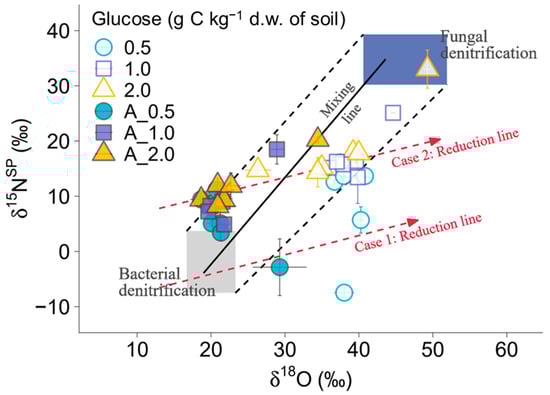 For soils amended with Glu_0.5, fBD increased progressively as incubation time progressed (p < 0.001). This trend was likely attributable to the gradual depletion of carbon resources over increasing incubation time. Under such conditions, limited carbon resources were preferentially utilized by denitrifying bacteria over fungi, thereby promoting bacterial denitrification. This finding demonstrates that bacteria are more competitive than fungi in utilizing simple carbon sources, which aligns with previous studies regarding the effects of different carbon sources (glucose, cellulose, winter pea, and switchgrass) on N2O emissions [13]. When glucose concentration increased to Glu_1.0, compared to the Glu_0.5 treatment, as incubation time progressed, elevated carbon availability intensified competition between FD and BD over the course of incubation. By the end of the incubation period, this competition ultimately resulted in enhanced bacterial denitrification, as denitrifying bacteria outcompeted fungi for simple carbon resources [13]. With glucose concentration further increased to Glu_2.0, fFD increased, whereas fBD decreased with prolonged incubation except for an extremely high fBD observed on day 1 in Case 2. Compared to the two other glucose-amended treatments, this opposite trend may be attributed to glucose-induced osmotic pressure inhibiting bacterial growth in the tested soil [22]. This fFD enhancement induced by increasing glucose concentrations was corroborated by both a significant increase in δ15NSP with rising glucose concentrations (p < 0.001) and a significant positive correlation between fFD and glucose concentration (Case 1: r = 0.48, p < 0.001; Case 2: r = 0.56, p < 0.001; Figure 6).