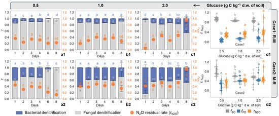 Bacterial (fBD) and fungal (fFD) contributions to denitrifying N2O production and residual N2O ratios (rN2O) estimated by the two scenarios (Case 1: (a1–d1); Case 2: (a2–d2)) of the δ15NSP/δ18O MAP in response to varied glucose concentrations in the tested vegetable soils. Letters indicate statistical significance among varied glucose concentrations using a two-sided Wilcoxon test (adjusted p < 0.05 by the Benjamini–Hochberg method).