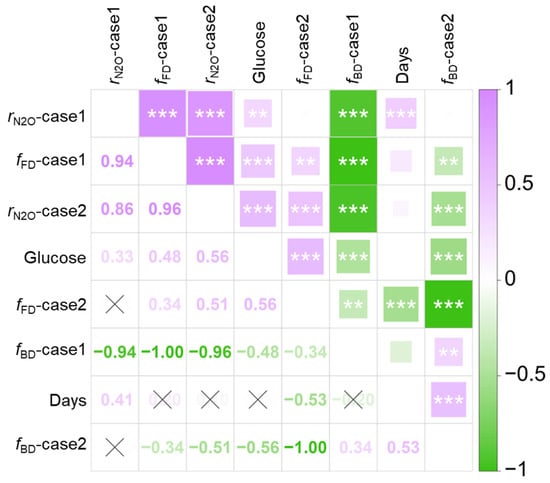 Both the δ15NSP/δ18O MAP and the acetylene inhibition technique (AIT) were used to determine the N2O residual ratio (rN2O). The results indicated that increasing glucose concentrations significantly increased rN2O for both cases (p < 0.05 for Case1 (rN2O_case1) and p < 0.001 for Case2 (rN2O_case2); Figure 5d1,d2), which was corroborated with Spearman correlations between rN2O_case1 and glucose concentration (r = 0.33, p < 0.01) and between rN2O_case2 and glucose concentration (r = 0.56, p < 0.001; Figure 6). As shown in Figure 5a1,a2, for the Glu_0.5 treatment, rN2O peaked on day 1 in both cases (0.37 ± 0.01 for rN2O_case1 and 0.44 ± 0.01 for rN2O_case2). This was followed by a temporary decline; thereafter, rN2O exhibited an overall decreasing trend with fluctuations. When the glucose concentration increased to Glu_1.0, the rN2O peak was delayed to day 3 (0.40 ± 0.02 for rN2O_case1 and 0.47 ± 0.02 for rN2O_case2; Figure 5b1,b2), with subsequent temporal trends similar to those observed in the Glu_0.5 treatment. With a further increase in glucose concentration to Glu_2.0, rN2O progressively increased over the initial three days (Figure 5c1,c2), reaching its first peak on day 3 (0.46 ± 0.05 for rN2O_case1 and 0.52 ± 0.04 for rN2O_case2). This was followed by a sudden decrease (p < 0.05), after which rN2O progressively increased again over the final four days, reaching its highest value on day 8 in both cases (0.95 ± 0.09 for rN2O_case1 and 0.95 ± 0.08 for rN2O_case2).