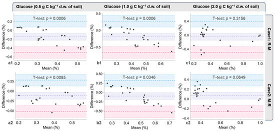 Bland–Altman analysis comparing residual N2O ratio (rN2O) between the reduction–mixing scenario (Case 1: (a1–c1)) of the δ15NSP/δ18O MAP and the acetylene inhibition technique (AIT), and between the mixing–reduction scenario (Case 2: (a2–c2)) of the MAP and the AIT, with 95% limits of agreement (LoA) across different glucose concentrations in the tested vegetable soils. Statistical comparisons of rN2O between the two methods were evaluated by paired t-tests.