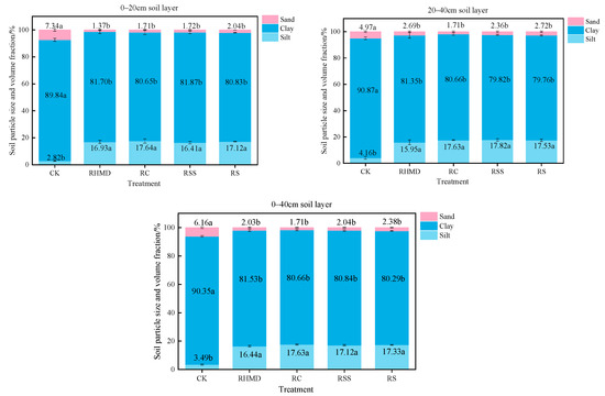 Soil particles are categorized into three groups according to the USDA classification system: clay particles (<2 μm), meal particles (2–50 μm), and sand particles (>50 μm). As can be seen from Figure 1, the soil particle composition of the 0~40 cm soil layer of perennial rice (CK) had the highest volume content of powder particles (about 90.35%), and the volume content of clay particles and sand particles was lower, compared with CK, the different rotational treatments could significantly change the distribution of soil particles in the 0~40 cm layer of the soil (p < 0.05), and there was no significant difference between the different rotational methods. The law of change in soil particle composition in the 0~40 cm soil layer under different crop rotations was as follows: the volume content of clay particles increased by about (16~18%), the volume content of sand particles decreased, but the overall volume content of powder particles was still the highest (about 81%), and the soil texture was gradually transformed from chalky soil to chalky loam.