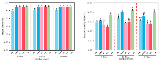 As can be seen from Figure 2, different crop rotation treatments significantly increased the fractal dimension of soil 0–20 cm soil layer and 20–40 cm soil layer compared with CK, and there was no significant difference among the crop rotation treatments. Compared with CK, RS treatment significantly increased the SI value of 0–20 cm soil layer by 27.96%, while RHMD treatment and RS treatment significantly increased the SI value of 20–40 cm soil layer by 18.85% and 24.97%, respectively. Overall, RS treatment significantly (p < 0.05) increased the SI value of 0–40 cm soil layer by 26.37% compared to CK.
