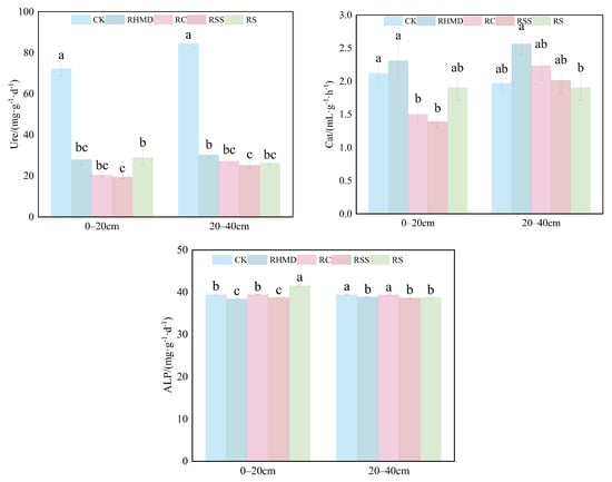 As can be seen from Figure 3, in the 0–20 cm soil layer, different crop rotation treatments significantly decreased soil urease activity (p < 0.05) compared to CK by 61.33%, 71.65%, 73.05, and 59.93%, respectively. RC and RSS treatments significantly decreased soil catalase activity compared to CK by 29.25% and 34.43%, respectively, and RHMD and RSS treatments significantly decreased soil alkaline phosphatase activity by 2.74% and 1.80%, respectively. Further, RS treatment significantly increased soil alkaline phosphatase activity by 5.34% compared to CK. In the 20–40 cm soil layer, different crop rotation treatments significantly reduced soil urease activity compared to CK by 64.22%, 67.83%, 70.19, and 69.03%, respectively, while RHMD, RSS, and RS treatments significantly reduced soil alkaline phosphatase activity compared to CK by 1.42%, 2.05%, and 1.75%, respectively.