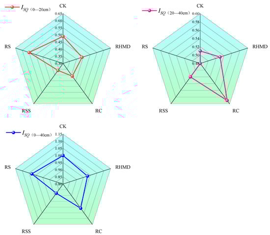 In this study, the full dataset (16 indicators in total) was applied to analyze the soil quality indices for the 0–40 cm soil layer, which can be seen in Figure 4. In the 0–20 cm soil layer, the soil quality indices under the treatments, in descending order, were RS (0.55) > CK (0.49) > RHMD (0.44) > RC (0.41) > RSS (0.36); in the 20–40 cm soil layer, these were RC (0.59) > RHMD (0.53) > RSS (0.52) > CK (0.51) > RS (0.48) in descending order; in the 0–40 cm soil layer, they were RS (1.03) > RC (1.01) > CK (1.00) > RHMD (0.98) > RSS (0.88) in descending order. In summary, the RS treatment can better improve the soil quality of the 0–20 cm soil layer, and the RC, RHMD, and RSS treatments can better improve that of the 20–40 cm soil layer. RS (rice–soybean) and RC (rice–corn) can better improve the soil quality of the 0–40 cm soil layer, and they are suitable for use in the north of the Yinbei area and the north-Yin area.