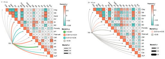 Mantel correlation analysis showed that the soil quality index of the surface layer (0–20 cm) was significantly correlated with soil structure factor, alkaline-dissolved nitrogen, and alkaline phosphatase (0.001 < p < 0.01), and was more affected by quick-acting phosphorus (p < 0.001, Figure 5, left); the soil quality index of the 20–40 cm soil layer was only affected by the soil structure factor (0.001 < p < 0.01, Figure 5, right).