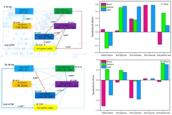 The total standardized effects of the structural equations showed that in the 0–20 cm soil layer, the salinity factor had the largest negative effect on the soil quality index (−0.395), and soil physical properties, soil nutrients, soil enzyme activities, and soil particles had a positive effect on the soil quality index, with total standardized effects of 0.755, 0.739, 0.785, and 0.191, respectively. In the 20–40 cm soil layer, soil nutrients had the largest negative effect on soil quality index (−0.945), indicating that crops absorbed a large amount of nutrients from the soil during growth; attention should be paid to the timely application of fertilizers to maintain soil fertility. This was followed by the salinity factor (−0.744), and soil particles had the largest positive effect on soil quality index (0.775). Overall, the salinity factor and soil nutrients were the key factors restricting the improvement of saline soil quality in north Yinbei.