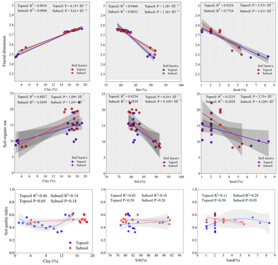 Relationship between soil fractal dimension, organic matter, soil quality index, and soil particle composition under different rotation methods.