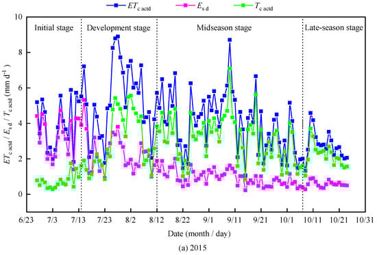 During the initial stage, daily Es d and Tc actd ranged, respectively, from 1.40 to 4.73 mm d−1 (3.26 mm d−1 averagely and 58.70 mm totally) and from 0.30 to 1.74 mm d−1 (0.77 mm d−1 averagely and 13.86 mm totally) in 2015, and ranged, respectively, from 0.85 to 7.10 mm d−1 (3.70 mm d−1 averagely and 59.20 mm totally) and from 0.05 to 0.93 mm d−1 (0.28 mm d−1 averagely and 4.49 mm totally) in 2016 (Figure 2). With canopy coverage below 10%, soil evaporation predominated over rice transpiration, resulting in significantly higher Es d than Tc actd, with the ratio of Es d to ETc actd exceeding 80%. During the development stage in both years, Es d ranged from 0.91 to 5.32 mm d−1 (2.28 mm d−1 averagely and 66.25 mm totally) and from 0.65 to 4.75 mm d−1 (3.09 mm d−1 averagely and 80.28 mm totally), respectively. Meanwhile, Tc actd ranged from 0.85 to 5.57 mm d−1 (3.06 mm d−1 averagely and 88.60 mm totally) and from 2.07 to 6.21 mm d−1 (3.71 mm d−1 averagely and 96.50 mm totally), respectively. With the rapid increase in LAI and significant enhancement in transpiration, while receiving decreasing solar net radiation, Es d decreased and Tc actd increased, and ETc actd gradually shifted towards being dominated by Tc actd during the later development stage. During the mid-season stage, LAI gradually reached its peak and the canopy almost reached a closed state, soil evaporation continued to decrease, with total daily Es d of 51.98 mm and 72.36 mm and total daily Tc actd of 173.61 mm and 198.46 mm for 2015 and 2016, respectively, and Tc actd dominated ETc actd. During the late-season stage, rice leaves gradually withered and dropped, and LAI decreased, leading to a decline in crop coverage. However, the available soil moisture for evapotranspiration decreased due to the lower soil moisture content during this stage, resulting in a decreasing trend in soil evaporation. Influenced by both field soil moisture status and meteorological conditions, ETc acth, Es h, and Tc acth exhibited a multi-peak and multi-valley pattern during the rice growing season, similar to results reported for other crops [42].