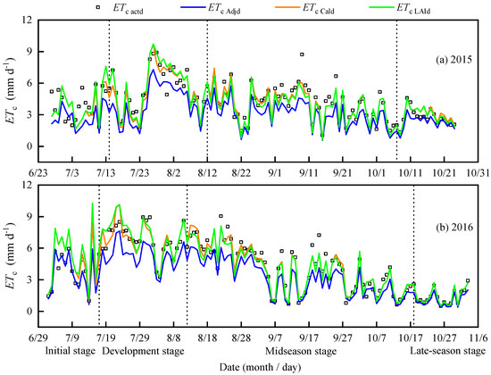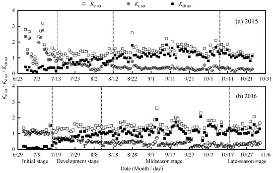 During initial, development, midseason and late-season stages, Kc act in 2015 and 2016 were 1.67, 1.24, 1.54, 1.34 and 1.17, 1.33, 1.45, 1.46, respectively (Figure 3). These Kc act values were notably higher than the range of 0.40 to 1.05 observed in the rice-growing regions of Japan [51], but were similar to the range of 1.10 to 1.60 in the monsoon regions of Asia [52]. These Kc act values in the current study also fell within the ranges observed in South India (0.88 to 1.99), Pakistan (0.80 to 1.95), and North India (0.62 to 2.32). The average differences in Kc act between 2015 and 2016 ranged from −0.13 to 0.51, indicating inter-annual differences in Kc act; these findings align with monitoring results from drainage lysimeters at the research site [53], and are consistent with conclusions drawn from other regions [49].