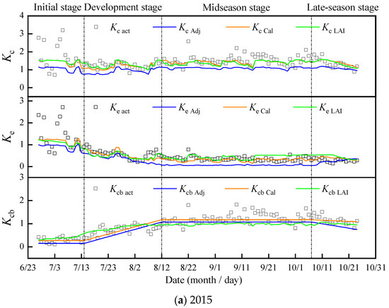 Kcb act, Ke act and Kc act were estimated following three approaches, namely FAO56 adjusted coefficients (Equation (14)), FAO56 calibrated coefficients, and LAI-based coefficients (Equation (15)). For FAO56 calibrated coefficients, Kcb ini, Kcb mid and Kcb end were calibrated based on Kcb act, and Kcp in Equation (18) was corrected after irrigation when De,i < REW based on Ke act. Finally, the ETc acth, Es h, Tc acth and ETc actd, Es d, Tc actd were estimated based on these estimated coefficients (Equations (11)–(13)). Statistics of determination coefficient R2 and root mean square error RMSE (Equations (22) and (23)) were used to illustrate the performance of these coefficients in estimating ETc acth, Es h, Tc acth and ETc actd, Es d, Tc actd.