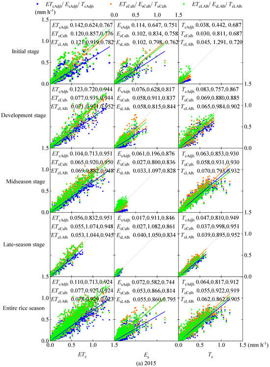 Scatterplots of estimated versus actual values for hourly crop evapotranspiration ETc, soil evaporation Es and rice transpiration Tc during initial, development, midseason, late-season stages and the entire rice season in 2015 and 2016 (X-axis represents measured ETc, Es and Tc, and Y-axis represents simulated ETc, Es and Tc; ETc Adjh, Es Adjh and Tc Adjh denote, respectively, estimated ETc, Es and Tc based on FAO56 adjusted coefficients, ETc Calh, Es Calh and Tc Calh denote, respectively, estimated ETc, Es and Tc based on FAO56 calibrated coefficients, and ETc LAIh, Es LAIh and Tc LAIh denote, respectively, estimated ETc, Es and Tc based on leaf area index-based coefficients; the three values in each subplot represent the root mean square error, the slopes of the linear regression between simulated and measured values, and coefficient of determination).