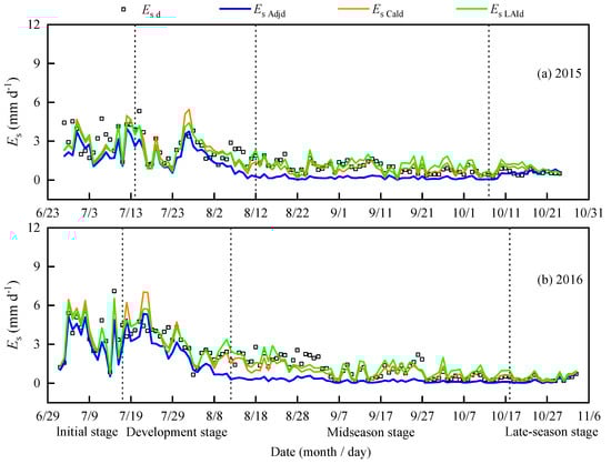 Seasonal variations in measured and estimated daily soil evaporation (Es d denotes measured daily soil evaporation, Es Adjd, Es Cald, Es LAId, respectively, estimated daily soil evaporation based on FAO56 adjusted and calibrated coefficients, and leaf area index-based coefficients).