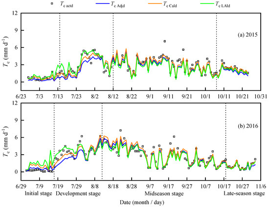 Seasonal variations in measured and estimated daily rice transpiration (Tc actd denotes measured daily rice transpiration, Tc Adjd, Tc Cald, Tc LAId, respectively, estimated daily rice transpiration based on FAO56 adjusted and calibrated coefficients, and leaf area index-based coefficients).