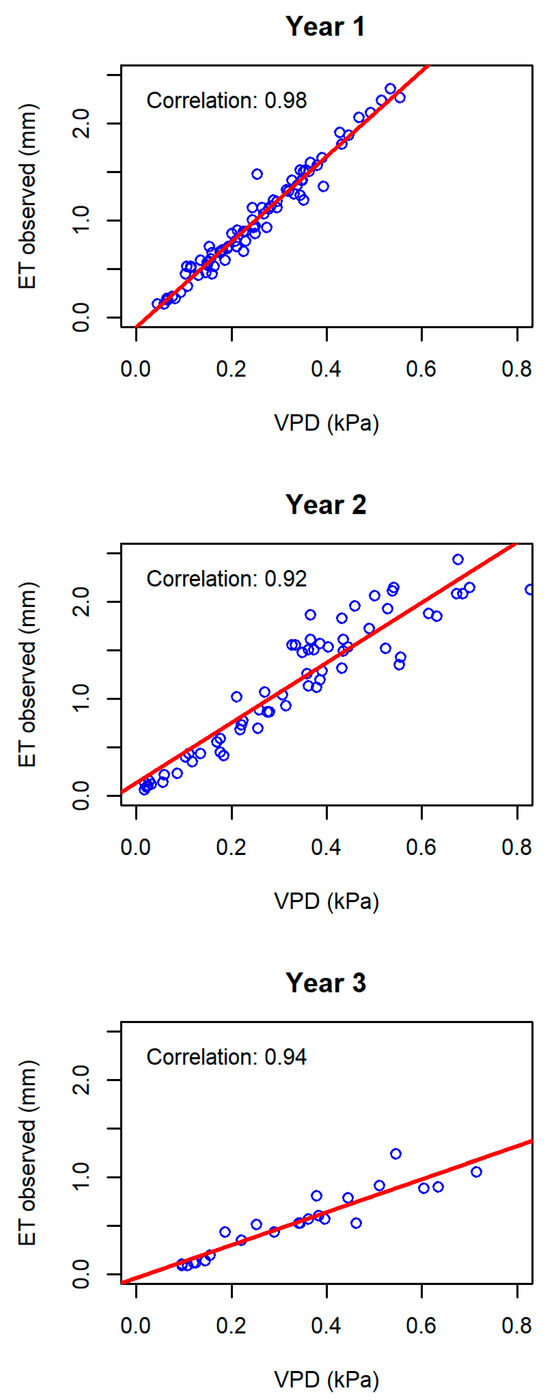 First, year 3 has overall lower observed evapotranspiration values than year 1 or 2 (means: year 3 = 0.5046 mm, year 1 = 1.3685 mm, year 2 = 1.5989 mm; means for years 1 and 2 calculated for the first 26 days for consistency with shorter data collection period in year 3 [11]). This difference might suggest that TVPD overpredicts when evapotranspiration is low. However, when considering just the 31 lowest evapotranspiration values from year 1 (mean = 0.4965), which have a mean similar to the 26 values observed in year 3 (means = 0.5048), the RMSE and bias for the year 1 points are low while the r2 value is high, suggesting that the model performs well (year 1: RMSE = 0.0790 mm, bias = 0.0083 mm, r2 = 0.83; year 3: RMSE = 0.5430 mm, bias = 0.4428 mm, r2 = 0.44). Therefore, it is unlikely that there is a general tendency by TVPD to over-predict at low evapotranspiration.