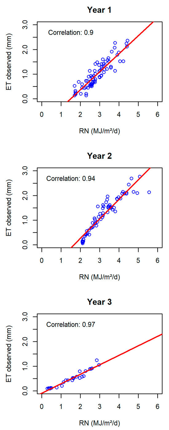 Strong correlation exists between solar radiation (RN) and evapotranspiration (ET) across the three years of data extracted from Shao et al. [11]. Blue dots indicate observed daily data points. The red line shows the fitted linear regression.