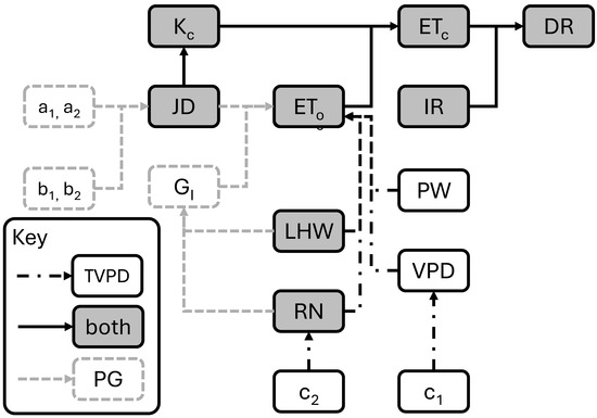 where DR is the predicted daily drainage (mm d−1), and IR is the daily measured irrigation (mm d−1). To overcome inconsistencies in irrigation systems, IR needs to exceed ETc by at least 20% [27]. A flowchart depicting the parameters and variables as inputs for each equation in TVPD and PG in relation to ETc and DR is depicted in Figure 3.