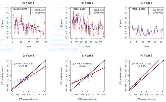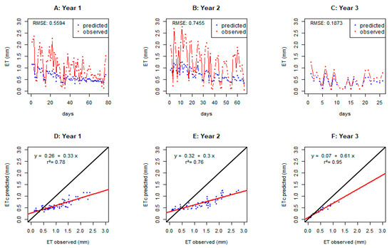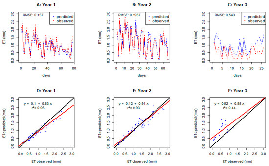 PGc-predicted ETc (blue) and observed evapotranspiration (ET, red) values (mm) across the days of each year (A–C). PGc-predicted ETc and observed evapotranspiration (ET) values (mm) with the regression line (red) and the 1:1 line (black) for each year (D–F).