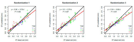 As each model showed different behaviors over each year of the dataset, we asked whether model prediction could be improved by using a subset of data pulled from across years rather than a single year. We combined the data from all three years and randomly pulled 84 days of data for calibration of TVPD1 (breakpoint, Equation (7)), leaving the remaining 85 days for evaluation. We performed this three times, using three different data randomizations. The data for each randomization were evenly selected across years, and each year’s evaluation data were approximately evenly spread along the regression line (Figure 8). Compared to our original calibration strategy, RMSE and r2 ranged between those observed for years 1 and 2 and year 3. However, both RMSE and r2 were consistent across the three calibrations, unlike with the other models and other calibration strategies. RMSE ranged from 0.2387 to 0.2419 across the calibrations (Table 4), much lower than the 0.5430 for year 3 using the original calibration strategy (Table 3). Values for r2 ranged from 0.88 to 0.91 across the three calibrations, higher than the 0.44 for year 3 using the original calibration strategy (Table 3 and Table 4). Bias analysis showed that TVPD1 using a randomized data subset for calibration consistently overpredicted for the data subset (Table 4). However, as with RMSE and r2, bias was minimal and consistent across the three calibrations, ranging from 0.0174 to 0.0530. Bias was also smaller than had been previously observed for TVPD with and without the breakpoint when compared against the evaluation sets of year 1 and year 3 (Table 3 and Table 4). The regression line was consistently different from the 1:1 line across all three randomizations, as was true in almost all years of PGg and in PGc, TVPD1, and TVPD2 calibrated using year 2. In sum, using a random subset of data spanning different years improved the consistency of model prediction. The model was also calibrated and evaluated on the combined dataset using 5-fold cross-validation, with 80% of the data being used for calibration and 20% being used for evaluation at each iteration. This resulted in less variance in the metrics (mean RMSE = 0.3024 (±0.0615) mm; mean r2 = 0.82 (±0.13); mean bias = 0.0625 (±0.0622) mm).