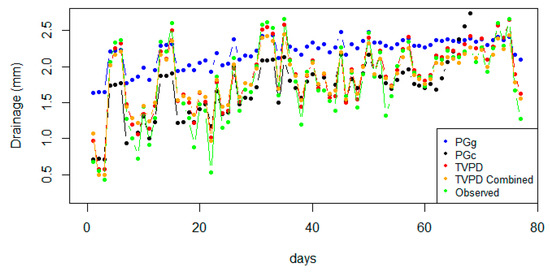 Values of estimated drainage (mm) for year 1 for PGg (blue), PGc (black), TVPD1 (red), and observed (green), as well as for TVPD1 with parameters from the first randomization of the combined data (orange). These values are based on predicted ETc being subtracted from an IR of 2.8 mm. In the case of observed drainage, the observed evapotranspiration values from Shao et al. [11] were subtracted from an IR of 2.8 mm.