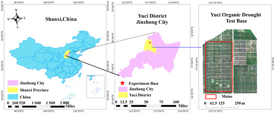 The experiment was conducted from 10 May to 10 October 2024, at the organic dryland experimental base in Lifang, Yuci, Jinzhong City, China (N 37°51′, E 112°45′), as shown in Figure 1. The area belongs to a warm temperate continental climate zone, characterized by four distinct seasons, large diurnal temperature variation, and notable arid to semi-arid conditions. The annual sunshine duration ranges from 2000 to 3000 h, the annual evaporation is 1500 to 2300 mm, the frost-free period lasts 120 to 220 days, and the elevation ranges from 767 m to 1777 m. The average temperature in 2024 was 10.7 °C, with precipitation between 413 and 471 mm, exhibiting uneven distribution.