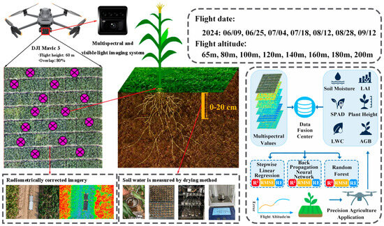 To address these gaps, this study systematically evaluates the quantitative effects of UAV flight altitude on the monitoring accuracy of soil moisture and key maize phenotypic parameters. Specifically, the objectives are as follows: (1) to reveal correlation patterns between vegetation indices and parameters across eight flight altitudes (65–200 m); (2) to evaluate the inversion accuracy and modeling errors of stepwise linear regression (SLR), random forest (RF), and back-propagation neural network (BPNN) models; and (3) to propose altitude-specific strategies for different applications, including high-precision field management, regional estimation, and large-scale reconnaissance. This work provides a theoretical and methodological basis for standardizing UAV operation parameters and supporting precision agriculture.