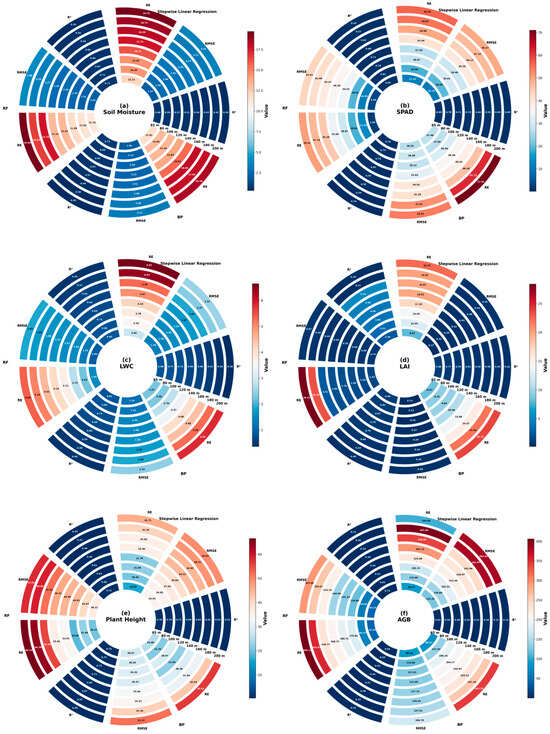Figure 4 compares the modeling performance of three methods—stepwise linear regression, random forest (RF), and back-propagation neural network (BP)—for soil moisture and maize phenotypic parameters (b. SPAD, c. leaf water content (LWC), d. leaf area index (LAI), e. plant height, and f. aboveground biomass (AGB)) at different flight altitudes (65–200 m). Each subplot presents the variation of evaluation metrics, including the coefficient of determination (R2), root mean square error (RMSE), and relative error (RE), with the flight altitude and modeling method, in the form of polar annular charts.