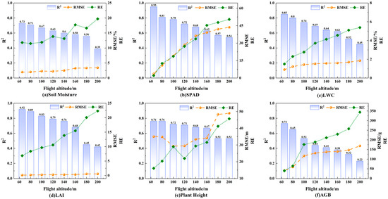 Variations of optimal modeling and R2, RMSE, and RE for maize soil moisture and phenotypic parameters at different flight altitudes. (a) Soil moisture; (b) SPAD; (c) leaf water content; (d) leaf area index; (e) plant height; (f) aboveground biomass.