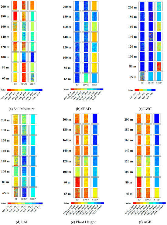 Spatial maps of inverted parameters at multiple flight altitudes on 10 July. (a) Soil moisture; (b) SPAD; (c) leaf water content; (d) leaf area index; (e) plant height; (f) aboveground biomass.
