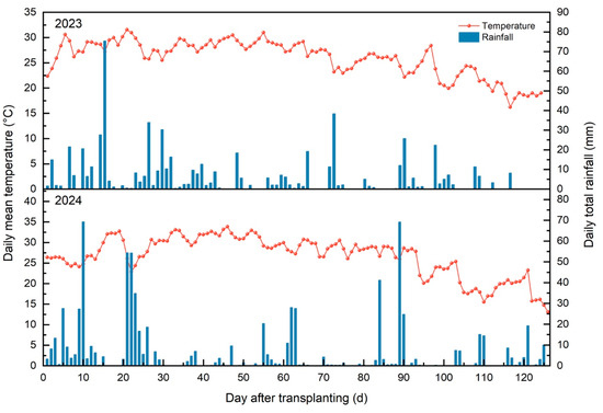 Daily rainfall and temperature from transplanting to harvest in 2023 and 2024.