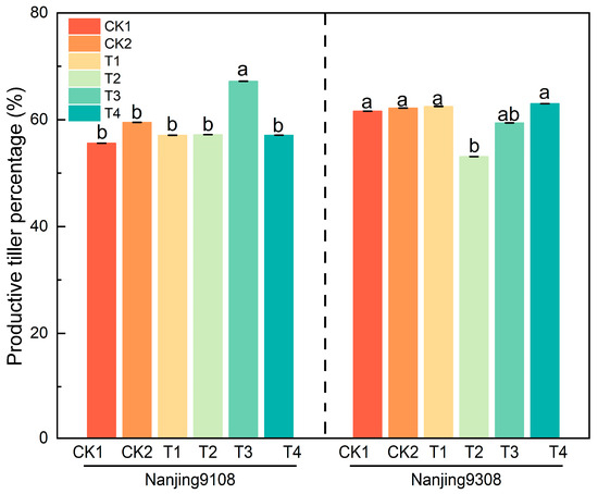 Effects of different fertilization treatments on rice productive tiller percentage. Different letters indicate a significant difference among treatments (p < 0.05).